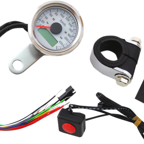 Caracteristicas: Programmable with any sending unit that sends 3,000 - 90,000 pulses per minute Gauge bezel measures 1-7/8" in diameter Overall length is approximately 2" L Feature a 12V LED backlit display Digital odometer and dual trip meters Indicators for high beam, neutral, oil pressure and turn signals Remote single-button switch allows easy changing between odometer and trip meter Color-coded wires and detailed wiring instructions Includes chrome mounting clamp for installation on 7/8" to 1-1/4" diameter tubing Mileage cannot be reset on speedometers