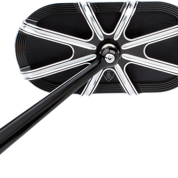Caracteristicas: Lightweight multi-piece design Forged from aluminum then CNC-machined to perfection Stainless steel machined pivot hardware Forged mirror stem Oval Mirror heads measure 5.45" wide x 2.5" tall