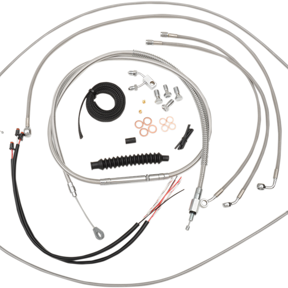 Caracteristicas: Take "cable calculation" headaches out of swapping handlebars Kits give you the correct length cables, brake lines and wire extensions you need so you can complete a handlebar swap Stainless braided kits include throttle cable, idle cable (unless noted), clutch cable, brake lines, chrome "T" brake line junction, banjo bolts, fittings and copper crush washers Made in the U.S.A. Kits are based on using 2" risers with Ape Hanger handlebars