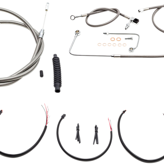 Caracteristicas: Take "cable calculation" headaches out of swapping handlebars Kits give you the correct length cables, brake lines and wire extensions you need so you can complete a handlebar swap Stainless braided kits include throttle cable, idle cable (unless noted), clutch cable, brake lines, chrome "T" brake line junction, banjo bolts, fittings and copper crush washers Made in the U.S.A. Kits are based on using 2" risers with Ape Hanger handlebars