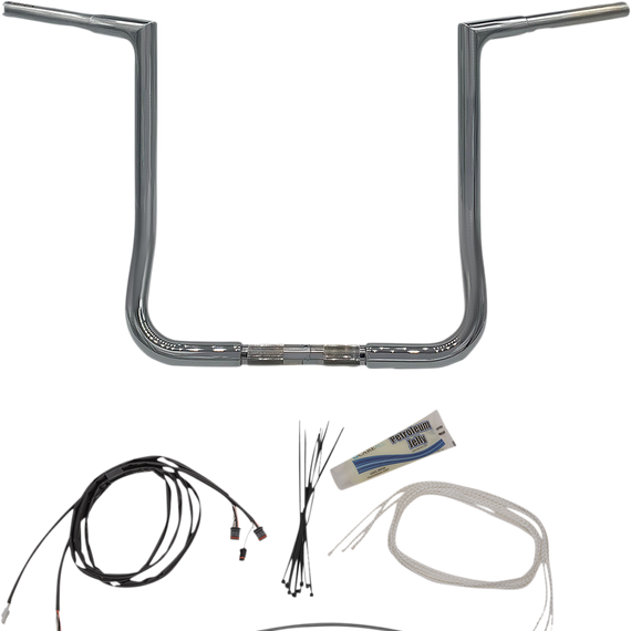 Caracteristicas: Bolt together, two-piece handlebar that takes up half the shelf space and is easy to ship CNC mandrel-bent from 1-1/4" diameter x .120" wall heavy tube EZ Install means no more need to fight internal wiring; you can install wiring in minutes Certain models and heights of handlebar kits will include a brake line extension, clutch line/cable extension and wiring harness, while some of the shorter handlebar kits will only contain a wiring harness or a clutch line/cable extension; each kit is priced accordingly Black handlebars come with black lines/cable extensions; chrome handlebars come with braided lines/cable extensions Knurled and notched for TBW applications Made in the U.S.A. Kits include only the necessary components needed to install handlebars based on the model and height of handlebar Patent No. 10,946,926