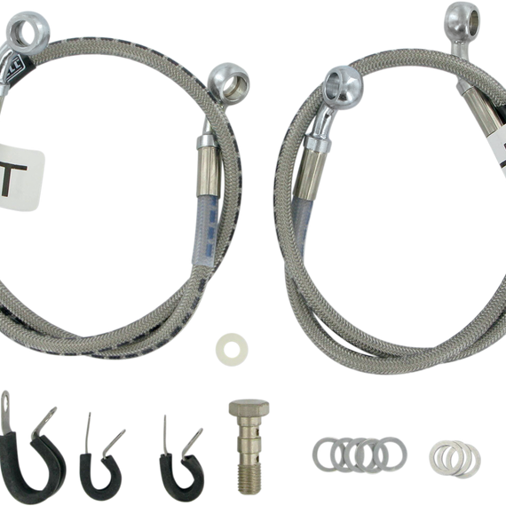 Caracteristicas: Long brake line connects to left caliper while short brake line connects to right caliper Resistance to expansion improves braking power and feel Special two-line configuration direct to master cylinder Lines clear-coated for abrasion protection