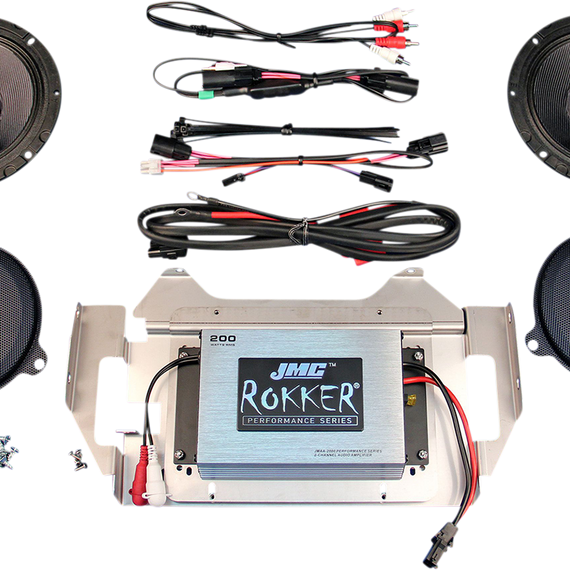 Caracteristicas: ROKKER speakers are spec'd at 2 ohms impedance and 200 watts maximum input (130w RMS - 91db sensitivity), these speakers provide excellent on-highway performance Speaker drivers feature lightweight waterproof woven-fiber cones with super-rigid metal basket and a high-density lite-weight Neodymium magnet structure with integral high-output PEI tweeters Mounting hole pattern and spade electrical connections are exactly the same as the factory specification, this is a total plug-and-play no-modification solution complete with easy to follow installation instructions The ROKKER 2-channel 200w amplifier kit has been designed specifically for use in the fairing with the stock Harley 4.3 Std, 6.5GT or GTS touch-screen radio, and is tuned for the stock Harley flash, NO SPECIAL FLASH needed This new kit will also connect to the Sony 7000 or Fosgate replacement HD radios with direct RCA-RCA connections (ONLY) and is easily adjustable in the field with a small screwdriver Amplifier mounts to custom made stainless steel 2-piece bracket system, to provide solid and secure mounting inside the fairing Custom made plug-n-play wiring harnesses/RCA-RCA direct cable adapters are included with this complete audio kit, top quality heavy gauge power/ground wires are used for the fused battery connection, along with all necessary mounting hardware & complete installation/operation instructions Amplifier measures 6-1/2” x 4-3/4“ x 1-3/4”