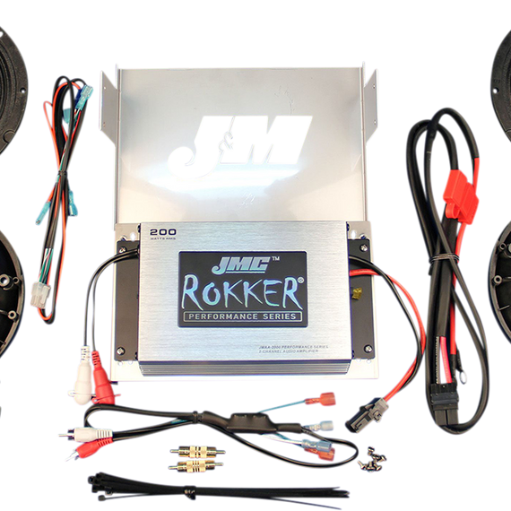Caracteristicas: ROKKER speakers are spec'd at 2 ohms impedance and 200 watts maximum input (130w RMS - 91db sensitivity), these speakers provide excellent on-highway performance Speaker drivers feature lightweight waterproof woven-fiber cones with super-rigid metal basket and a high-density lite-weight Neodymium magnet structure with integral high-output PEI tweeters Top-quality speaker grills, adapter rings and bracket hardware are included for secure and clean mounting The new ROKKER 2-channel 200w amplifier has been design specifically for use in the fairing with the Harley HK Radio, Harley RSI radio and Jensen, Aquatics or Fosgate replacement HD radios with direct RCA-RCA connections Custom made plug-n-play wiring harnesses/RCA-RCA direct cable adapters are included with this complete audio kit, top quality heavy gauge power/ground wires are used for the fused battery connection, along with all necessary mounting hardware & complete installation/operation instructions Amplifier measures 6-1/2” x 4-3/4“ x 1-3/4”