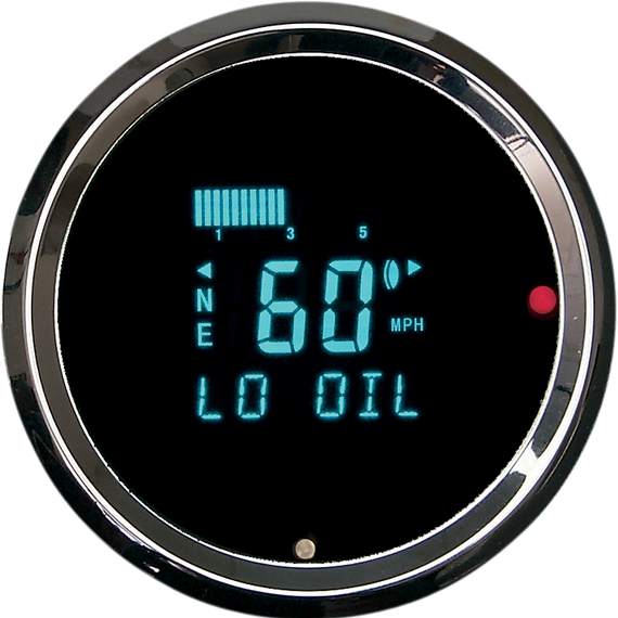 Caracteristicas: High-quality digital instruments that offer stable, accurate and easy-to-view readings Teal display offers high-contrast visibility, even in sunlight All gauges have machined aluminum housings, chrome front bezels and non-glare, scratch-resistant lenses Push button calibration Odometer has resettable trip meter 3011 model is an adjustable 199 mph speedometer that calibrates to almost any gearing and tire size combination; easy push button calibration Displays speed in numeric and bar graph form Odometer has two resettable trip meters and a miles-to-service meter with warning Features turn signal, low oil, high-beam and neutral indicators Performs calculations and displays high-speed recall, 0-60 timer and 1/4-mile time and speed Automatic turn signal canceling compatible 3-3/8” speedometer will fit the 96-06 FLTR, FLHT fairing.