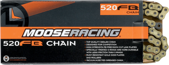 Caracteristicas: This is the top of the line; the strongest, most durable sealed chain that we offer FB = Fine Blanking, an incredibly precise manufacturing process that yields perfectly cut links Tight tolerances make the plate, pin, and bushing union accurate and strong Due to the accuracy of the cuts and the use of stronger alloyed steel, the FB has our highest tensile strength rating, nearly 8,000 lb. Special sealing rings are chemically treated to gain strength and reduce friction The FB treatment allows the O-rings to be impregnated with grease FB rings are stronger and more durable than X-rings, with significantly less friction Gold links and rollers, silver inner plates, pins and bushings Clip-type connecting link included Recommended for applications 450cc and above Replacement connecting link available
