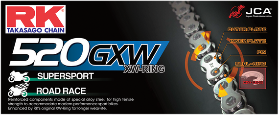 Caracteristicas: Advanced design XW-ring provides better sealing to extend wear life up to 100 percent XW-ring chains are the best high-speed, extreme heat performance chains available today Chains include rivet connecting link