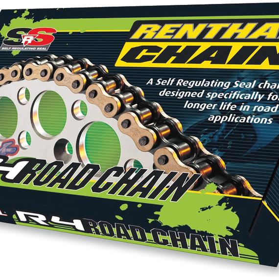 Caracteristicas: Specially developed sealed ring chain utilizes Renthal's Self Regulating Seal (SRS) technology to increase the service life of the chain in road applications; also enhances chain flexibility for smoother operation Feature high-alloy steel plates and pins, solid bushings and rollers, shot-peened side plates and gold sides Comes pre-stretched for less adjustment during break in Comes with a pair of latex gloves for mess-free installation Rivet only link included
