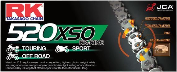 Caracteristicas: Pro X-ring chain lasts five to eight times longer than standard chain Provides two more lubricant pools than conventional O-rings for longer life Lubricated with specially formulated, vacuum-injected U-grease; locked in by tough Nitrile Butadine rubber X-rings Polished and shot-peened link plates High tensile strength ensures reliable performance Chains include rivet connecting link