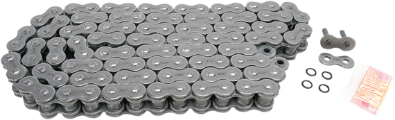 Caracteristicas: Lower friction loss Features quad pin riveting, solid bushings and rollers Shot-peened and pre-stretched Quality and durability at an affordable price 520 chain includes clip connecting link 525/530 chain includes rivet connecting link Made in Japan