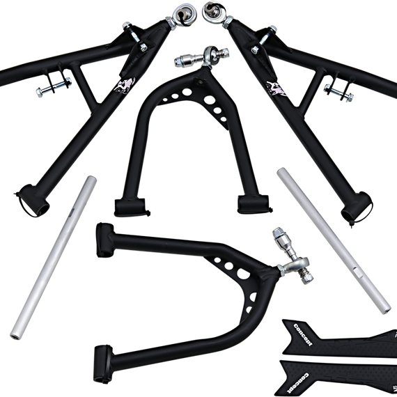 Caracteristicas: Perfect for extreme terrain riding Narrowed to 36" width Corrected geometry means spindle locations are maintained but new caster angles improve performance and handling Durable 4130 chromoly lower A-Arm and lightweight aluminum upper A-Arm Can use OEM shocks or any OEM length aftermarket shock Use OEM spindles All parts included for a complete installation Flat black
