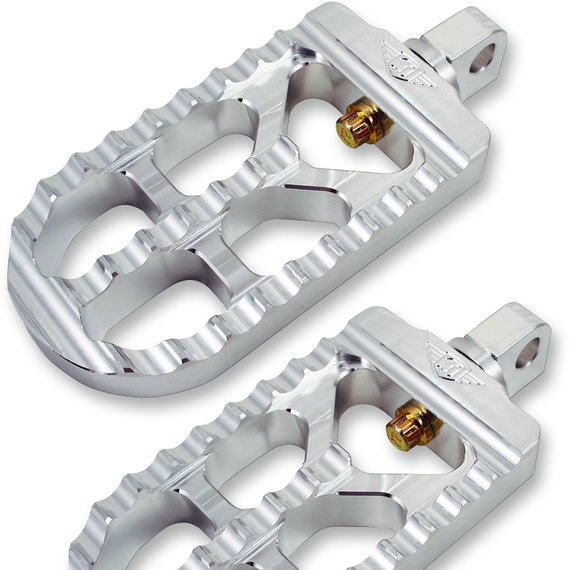 Caracteristicas: Give your bike a unique design twist with these all-billet aluminum adjustable serrated footpegs Fully CNC-machined from solid 6061 T-6 bar Super strong, yet lightweight two-piece construction The comfortable serrated foot surface area provides a good "bite" onto the bottom of your shoe Feature full 360° footpeg rotation making them perfect for any application Made in the U.S.A.
