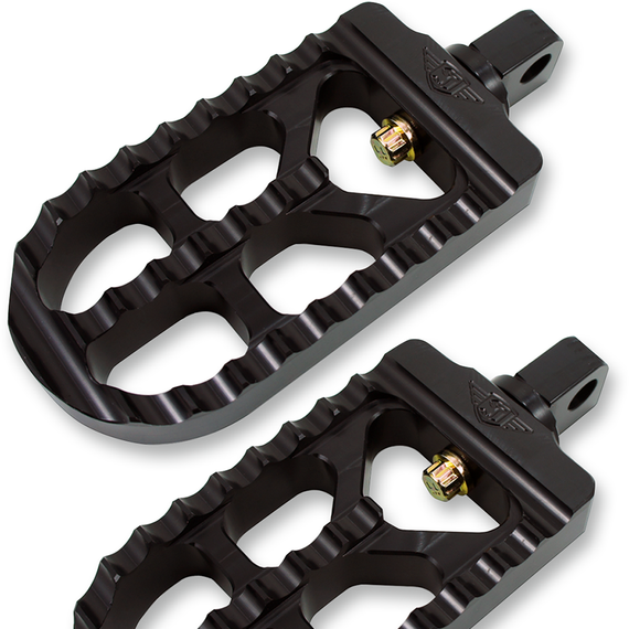 Caracteristicas: Give your bike a unique design twist with these all-billet aluminum adjustable serrated footpegs Fully CNC-machined from solid 6061 T-6 bar Super strong, yet lightweight two-piece construction The comfortable serrated foot surface area provides a good "bite" onto the bottom of your shoe Feature full 360° footpeg rotation making them perfect for any application Made in the U.S.A.