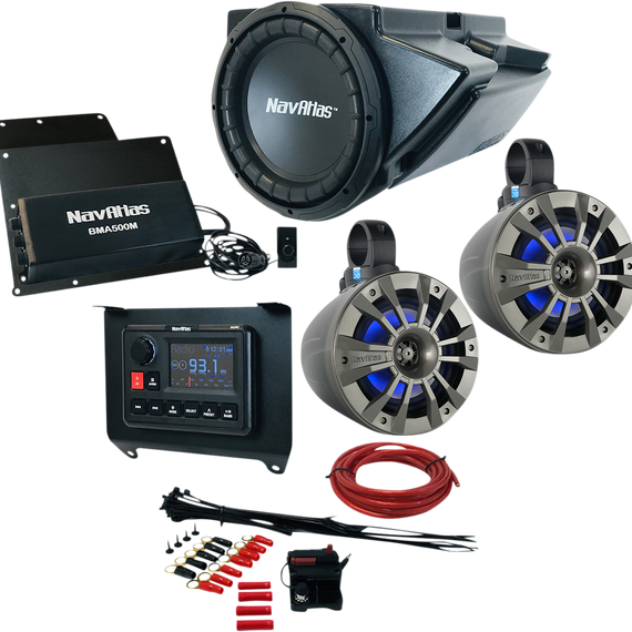 Caracteristicas: Kit includes 3" radio source unit with AM/FM/Weatherband tuner and built-in bluetooth 6-1/2” amplified roll-cage speaker system 10” 300W subwoofer and enclosure system w/ 500 W RMS mono subwoofer amplifier Dual amplifier bracket Installation kit with 60A circuit breaker Digital-to-digital cable for connecting amplifier to speakers IP66 rated