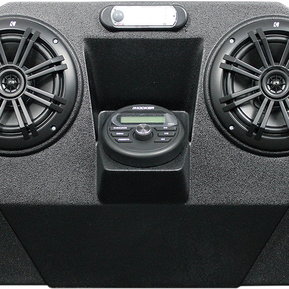 Caracteristicas: Light Features Surface-mounted LED dome light Ultra-bright, high output 150° light dispersion Sealed on/off switch Media Control Center Kicker® KMC2 multimedia gauge-style marine receiver with Bluetooth® AM/FM digital tuner (LED lights may cause signal interference when activated with AM/FM tuner) 200-watt peak power Speakers 4 Kicker® 6-inch KM-Series speakers 4-ohm voice coils 1/2" PEI tweeters Sealed motor structure Tuned to sound great while driving/riding UV-treated polypropylene woofer with Santoprene® Surround Design Features Plug-and-play harnesses with model-matching connectors Black powder-coated steel mounting brackets Fiberglass composite shell designed to match MULE PRO styling Infused resin process layered with directional fiber orientation for ultimate rigidity and strength Rigid design improves sound quality for the cleanest bass and crystal-clear highs Hoppe liner coating with sealed enclosures for durable, all-weather protection Compatible with factory roofs Not compatible with rear view mirror and high-mounted wiper kits in visor