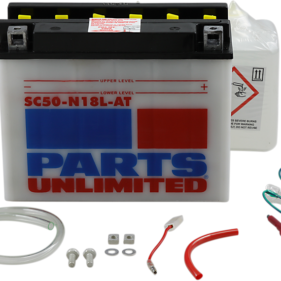 • Kit includes battery, pre-measured acid pack, red filler tube, hardware kit and clear vent tube