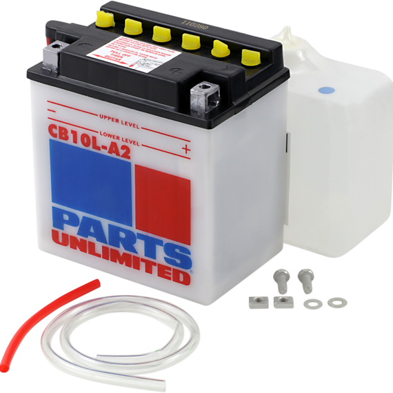 Caracteristicas: Powerful starting power at a great price! Parts Unlimited Heavy-Duty batteries are built to the same exacting specifications and quality-control standards as OEM Rugged and provide more cranking power over standard batteries Lead calcium alloy reduces water loss and service by 66% compared to standard batteries Includes anti-sulfation chemical formulated to reduce sulfate crystal buildup on the battery plates Reduces self-discharge for longer time between charges Fiberglass separators improve acid flow Kit includes battery, pre-measured acid pack, red filler tube, hardware kit and clear vent tube