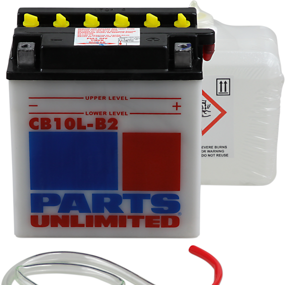 Caracteristicas: Powerful starting power at a great price! Parts Unlimited Heavy-Duty batteries are built to the same exacting specifications and quality-control standards as OEM Rugged and provide more cranking power over standard batteries Lead calcium alloy reduces water loss and service by 66% compared to standard batteries Includes anti-sulfation chemical formulated to reduce sulfate crystal buildup on the battery plates Reduces self-discharge for longer time between charges Fiberglass separators improve acid flow Kit includes battery, pre-measured acid pack, red filler tube, hardware kit and clear vent tube