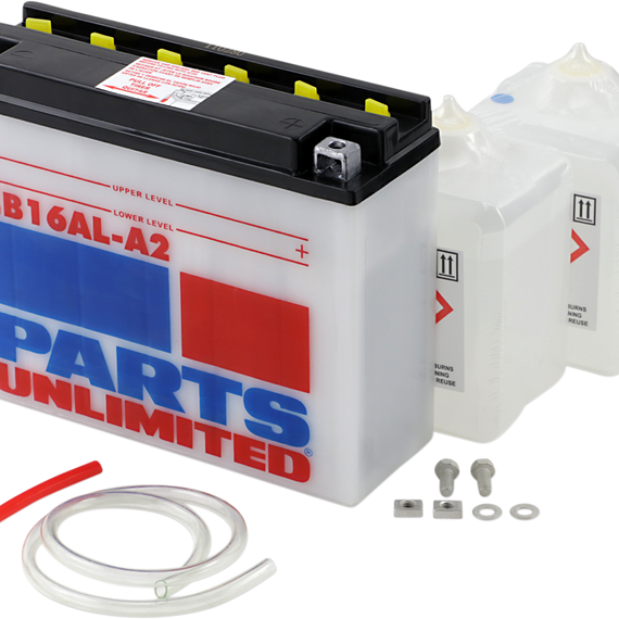 Caracteristicas: Powerful starting power at a great price! Parts Unlimited Heavy-Duty batteries are built to the same exacting specifications and quality-control standards as OEM Rugged and provide more cranking power over standard batteries Lead calcium alloy reduces water loss and service by 66% compared to standard batteries Includes anti-sulfation chemical formulated to reduce sulfate crystal buildup on the battery plates Reduces self-discharge for longer time between charges Fiberglass separators improve acid flow Kit includes battery, pre-measured acid pack, red filler tube, hardware kit and clear vent tube