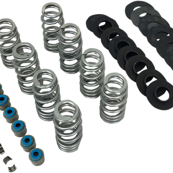 Caracteristicas: Made from premium stress-relieved conical ovate wire Feature extremely high-level of fatigue life Use a much smaller and lighter weight retainer to reduce valve weight and create quicker rev and smoother motion Designed to handle the demands of performance engines with 585" and smaller lift camshafts Kits include: Econo BeeHive® valve springs, lightweight 7° steel retainers, machined heat-treated chromoly spring seats, seat shims, valve locks and a set of premium Viton® valve seals equipped with spring-loaded valve stem wiper system Seat lbs./installed height; 183 lbs. at 1.770" (0.510" lift), 175 lbs. at 1.795" (0.535" lift), 172 lbs. at 1.813" (0.553" lift), 165 lbs. at 1.835" (0.574" lift), 160 lbs. at 1.845" (0.585" lift), 380 lbs. at 1.260" OPEN HEIGHT coil bind at 1.190" Dyno proven and track tested Feuling® BeeHive® valve springs must be installed at the correct OPEN HEIGHT, matching max lift to the open height spec of the valve springs Made in the U.S.A. Econo BeeHive® kits are direct replacement with no machining or rocker box clearance required for cams up to .574" lift for 84-04 Big Twin and 86-03 XL and up to .585" lift for 05-17 Twin Cam.