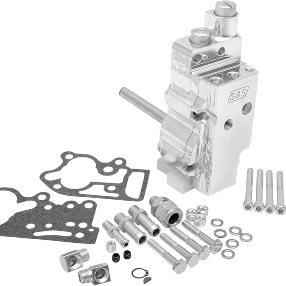 Caracteristicas: Kit includes an oil pump with cover, mounting bolts, supply and return gears, drive shaft with keys and snap rings, check ball and spring, pressure relief valve and spring, check ball and release valve cover screws with O-rings, miscellaneous hose fittings, plugs, screws and gaskets Pump features a smoother design and pressure relief towers that are .300" shorter than the OEM oil pump Accepts OEM steel oil lines and have late-style mounting bolt pattern Replacement gaskets available separately Made in the U.S.A.