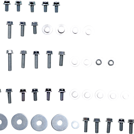Caracteristicas: Bolt kits for body plastics designed specifically for Suzuki Includes bolts for front and rear fenders, fork guards, front number plates, seats, side panels and radiator shrouds
