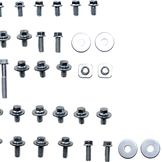 Caracteristicas: Bolt kits for body plastics designed specifically for Suzuki Includes bolts for front and rear fenders, fork guards, front number plates, seats, side panels and radiator shrouds