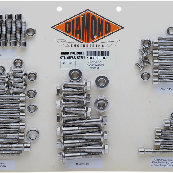 Caracteristicas: Hand-polished stainless steel engine kits are designed to provide a custom and detailed look with easy installation Five groups of fasteners will detail all your engine covers with a lasting shine Diamond Engineering's special hex flange rocker box bolts are included for Twin Cam models Includes fasteners for primary, inspections and inner primary; cam and points; oil pump or oil line cover, filter mount and sensors (Dyna and Touring models) or oil filter plugs and sensors (Softail Twin Cam); lifter blocks; and rocker boxes Made in the U.S.A.