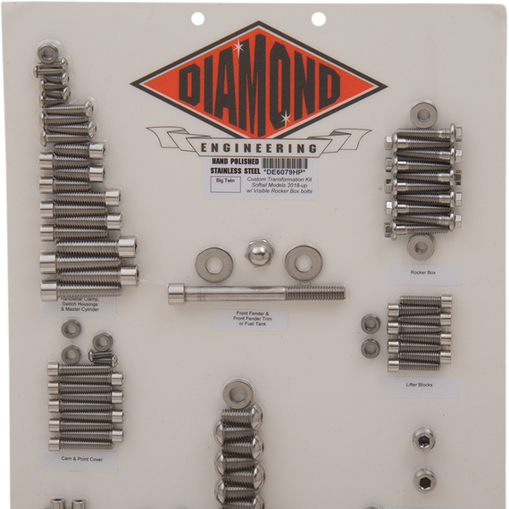 • Kits include fasteners for primary, inspections and inner primary; cam and points; oil pump or oil line cover, filter mount and sensors (Dyna and Twin Cam FLHT) or oil filter plugs and sensors (Softail Twin Cam); lifter blocks; rocker box; coil and circuit breaker covers (Dyna); transmission side cover; oil filler (FLHT models); transmission top cover; handlebar clamp, switch housings and master cylinder; front fender or front fender trim and fuel tank (FLHT models); rear fender rail or swingarm pivot blocks and rear floorboard brackets (FLHT models)