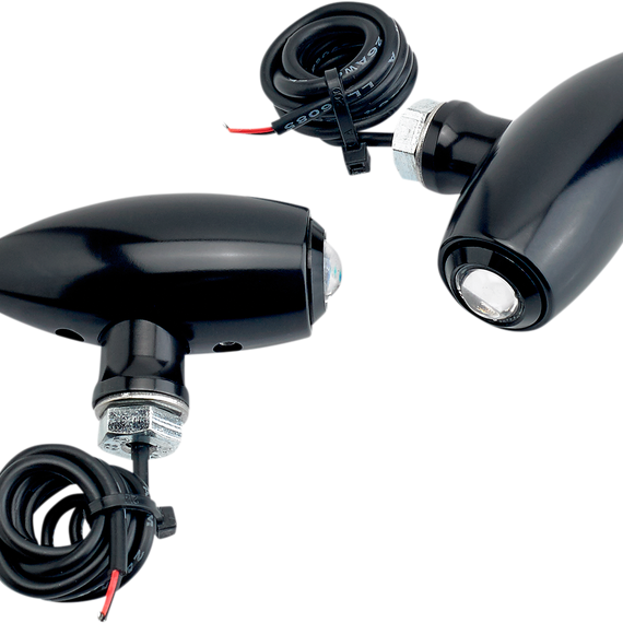 Caracteristicas: Bullet-style super-bright LED turn signal/marker lights really clean up the look of your bike Each features nine intensely bright LEDs in a cluster module for light output, amazing for its size (roughly 3/4" diameter at the light source) All parts are fully CNC-machined from 6061 T-6 billet aluminum May be rotated into virtually any upward-and-downward setting Dimensions: a little over 1" diameter, 2-3/8" long, and stand off the bike 1-1/2" Center-Mount Turn Signal Marker Lights can be mounted in almost any 5/16" or 8mm hole; wires feed through a pre-drilled hole in the mounting bolt Made in the U.S.A. If being used as turn signals, a load equalizer may be required Not DOT compliant