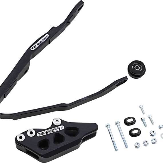 Caracteristicas: The kit includes front slider, lower frame pad & FE #2 rear guide with replaceable wear pad. Noise dampening pad system lowers chain slap noise. A special chain guidance backing plate keeps the chain constantly centered to improve suspension. The lower Powerlip frame pad last longer but more importantly lowers surface drag.