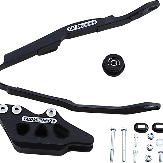 Caracteristicas: The kit includes front slider, lower frame pad & FE #2 rear guide with replaceable wear pad. Noise dampening pad system lowers chain slap noise. A special chain guidance backing plate keeps the chain constantly centered to improve suspension. The lower Powerlip frame pad last longer but more importantly lowers surface drag.