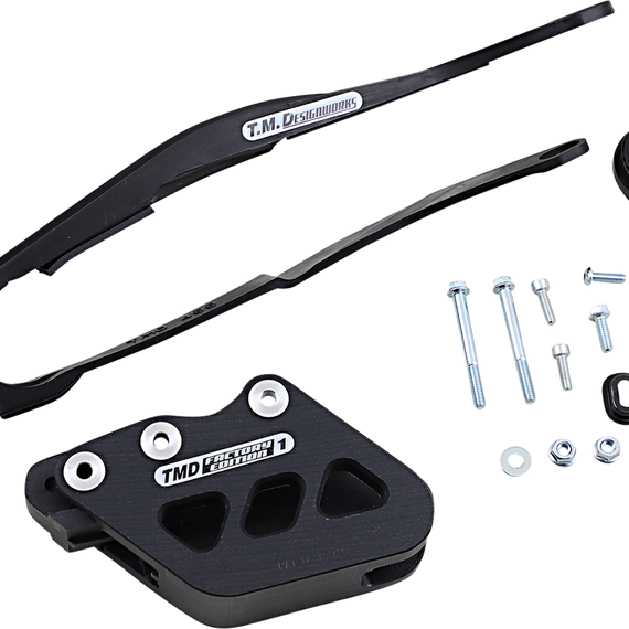 Caracteristicas: The kit includes front slider, lower frame pad & FE #2 rear guide with replaceable wear pad. Noise dampening pad system lowers chain slap noise. A special chain guidance backing plate keeps the chain constantly centered to improve suspension. The lower Powerlip frame pad last longer but more importantly lowers surface drag.