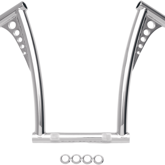 Caracteristicas: Add period-style bobber ape-hanger handlebars to your ride Bars are knurled, slotted and drilled for internal wiring Stylish multi-hole drilled corner gussets offer strength and rigidity Hand TIG welded Feature chrome billet end caps Not for throttle-by-wire applications Made in the U.S.A.