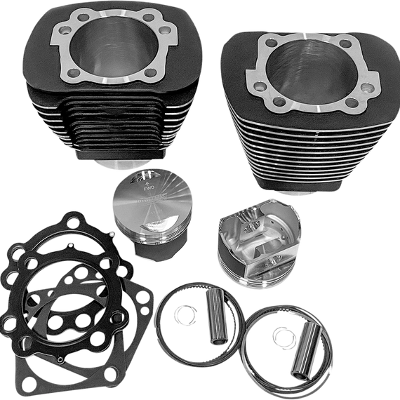 Caracteristicas: Revolution™ aerospace-grade all-aluminum cylinders with nickel-silicon-carbide electroplated bores, which means NO SLEEVING; allows larger bore sizes and less friction for more horsepower, lower temps, and a longer lifespan True bolt-on kit that delivers major power with no machine work required Also includes Wiseco forged pistons with rings (that are specifically designed for optimal compatibility with Revolution Performance's cylinders), wrist pins, circlips and high-performance head and base gaskets Replacement head and base gasket sets available separately Made in the U.S.A. For replacement pistons and rings, see Revolution Performance Big Bore Piston Kits.