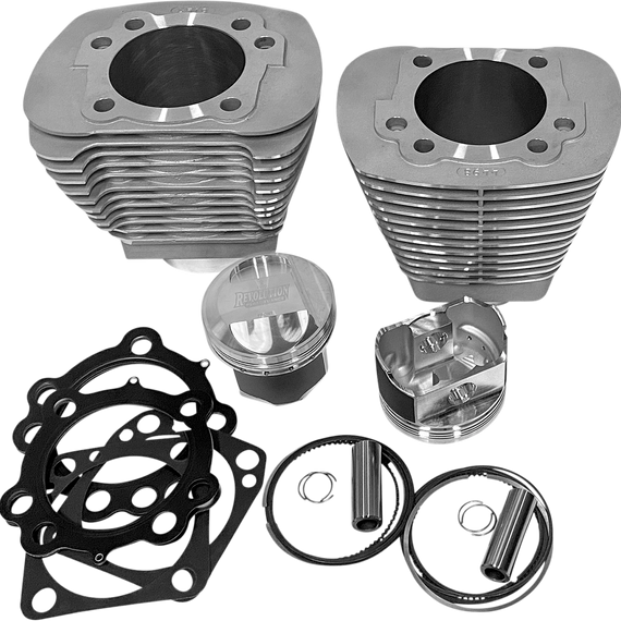 Caracteristicas: Revolution™ aerospace-grade all-aluminum cylinders with nickel-silicon-carbide electroplated bores, which means NO SLEEVING; allows larger bore sizes and less friction for more horsepower, lower temps, and a longer lifespan True bolt-on kit that delivers major power with no machine work required Also includes Wiseco forged pistons with rings (that are specifically designed for optimal compatibility with Revolution Performance's cylinders), wrist pins, circlips and high-performance head and base gaskets Replacement head and base gasket sets available separately Made in the U.S.A. For replacement pistons and rings, see Revolution Performance Big Bore Piston Kits.