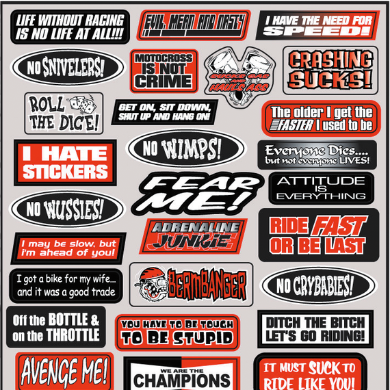 Caracteristicas: All kits have approximately 10-32 of your favorite stickers All stickers are 3" to 6" in length, printed on 4 mm clear vinyl Perfect for auto windows, bikes or toolboxes All kits have a printed clear coat to prevent fading
