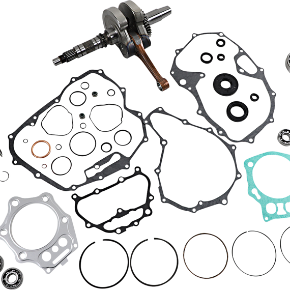 • Includes crankshaft, piston kit, complete engine gasket kit with oil seals, main bearings and seals, water pump rebuild kit, transmission bearings, countershaft bushing/seal kit, wrist pin bearing, cam chain and counter balancer bearings when applicable