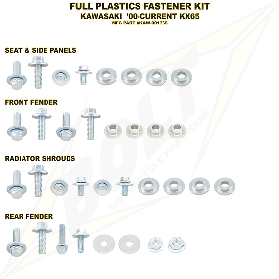 Aditamentos:KX 65 : 2004-2008-2009-2016-2002-2000-2001-2005-2007-2011-2012-2013-2014-2003-2006-2010-2015-2017-2018-2019 Specs:Product Name: Body Fastener Kit