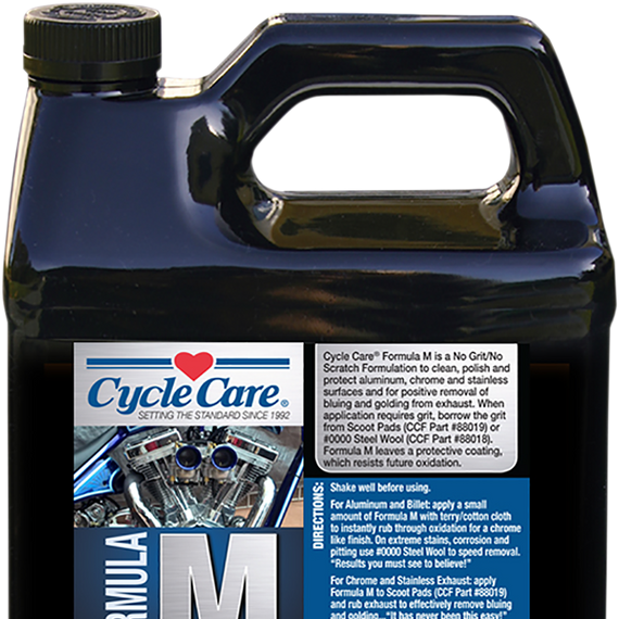 Caracteristicas: Cycle Care® Formula M is the best way to clean, polish and protect motorcycle metal surfaces A pumice-free and grit-free formulation will not scratch highly polished billet and chrome surfaces Easy on and off application, which makes polishing aluminum wheels and rims less labor intensive Quickly removes oxidation and polishes aluminum surfaces to a chrome-like finish Leaves a protective coat that resists future oxidation for a long-lasting shine, without using additional sealers or polishes Made in the U.S.A.