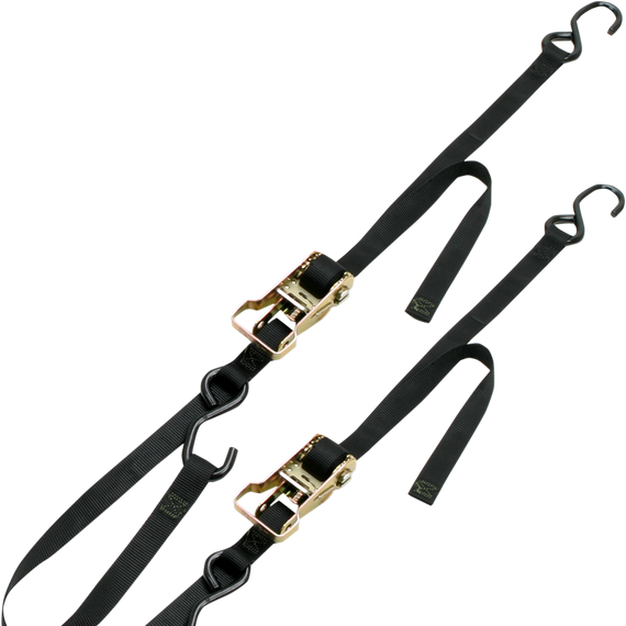 Caracteristicas: Twin pack of ratchet-buckle tie-downs with soft-hook tie-down straps for securing motorcycles, snowmobiles, ATVs and other equipment Same features as the original Rat Pak, but with a soft-hook tie-down strap Vinyl-coated hooks protect finish Durable nylon-web straps Ratchet buckles feature safety locks Made in the U.S.A.