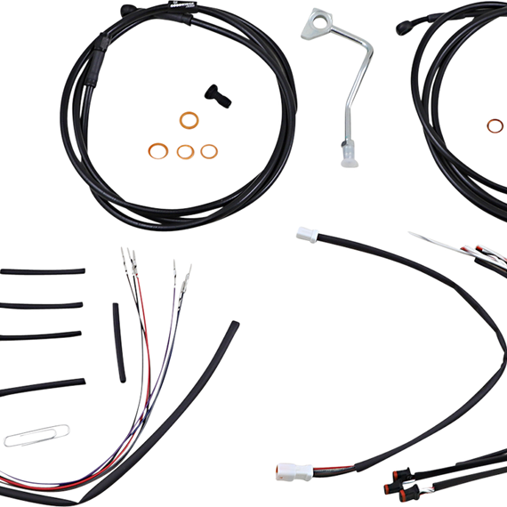 Caracteristicas: Complete installation kit for Burly Ape hangers Kits include extended brake line (unless noted), extended clutch cable/clutch line, extended throttle/idle cables as required and all necessary wiring Brake lines, when included, feature PTFE inner liner and heavy-duty stainless steel outer braid Dresser kits reuse stock Throttle-By-Wire harness Kits are based on using 2" risers with ape hanger-style handlebars
