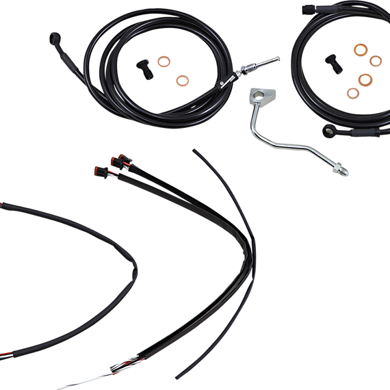Caracteristicas: Complete installation kit for Burly Ape hangers Kits include extended brake line (unless noted), extended clutch cable/clutch line, extended throttle/idle cables as required and all necessary wiring Brake lines, when included, feature PTFE inner liner and heavy-duty stainless steel outer braid Dresser kits reuse stock Throttle-By-Wire harness Kits are based on using 2" risers with ape hanger-style handlebars