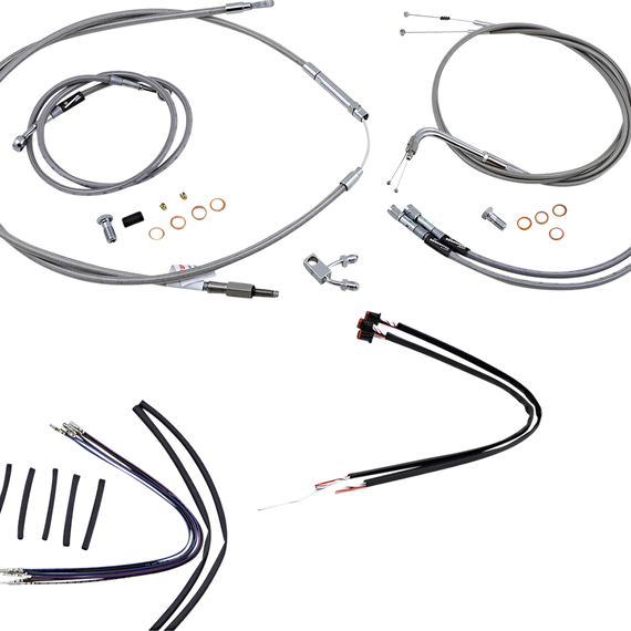 Caracteristicas: Complete installation kit for Burly Ape hangers Kits include extended brake line, extended clutch cable/clutch line, extended throttle/idle cables as required and all necessary wiring Brake lines feature PTFE inner liner and heavy-duty stainless steel outer braid Dresser kits reuse stock Throttle-By-Wire harness Kits are based on using 2" risers with ape hanger-style handlebars