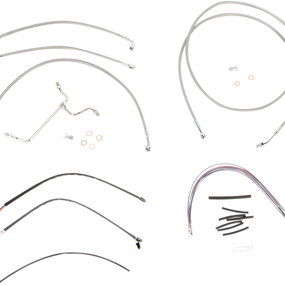 Caracteristicas: Complete installation kit for Burly Ape hangers Kits include extended brake line, extended clutch cable/clutch line, extended throttle/idle cables as required and all necessary wiring Brake lines feature PTFE inner liner and heavy-duty stainless steel outer braid Dresser kits reuse stock Throttle-By-Wire harness Kits are based on using 2" risers with ape hanger-style handlebars