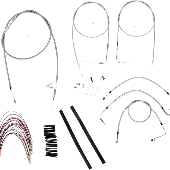Caracteristicas: Complete installation kit for Burly Ape hangers Kits include extended brake line, extended clutch cable/clutch line, extended throttle/idle cables as required and all necessary wiring Brake lines feature PTFE inner liner and heavy-duty stainless steel outer braid Dresser kits reuse stock Throttle-By-Wire harness Kits are based on using 2" risers with ape hanger-style handlebars