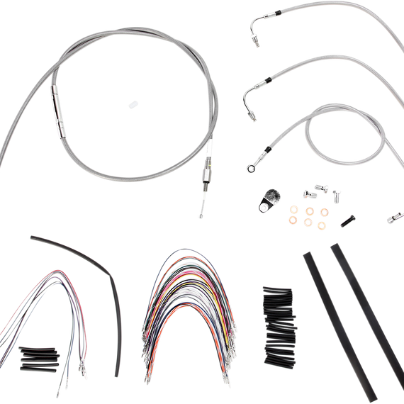 Caracteristicas: Complete installation kit for Burly Ape hangers Kits include extended brake line, extended clutch cable/clutch line, extended throttle/idle cables as required and all necessary wiring Brake lines feature PTFE inner liner and heavy-duty stainless steel outer braid Dresser kits reuse stock Throttle-By-Wire harness Kits are based on using 2" risers with ape hanger-style handlebars