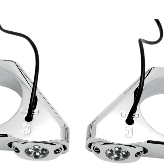 Caracteristicas: A new twist on Joker's classic fork mount turn signal/marker lights We upgraded our fork mount turn signal/marker lights with a super-bright LED pod for more visibility Made from 6061 T-6 billet aluminum Comes with amber LED pod lights LED pod lights are angled 25 degrees to accommodate the rake of the forks Made in the U.S.A. Not DOT compliant. If being used as a turn signal, a load equalizer is required.