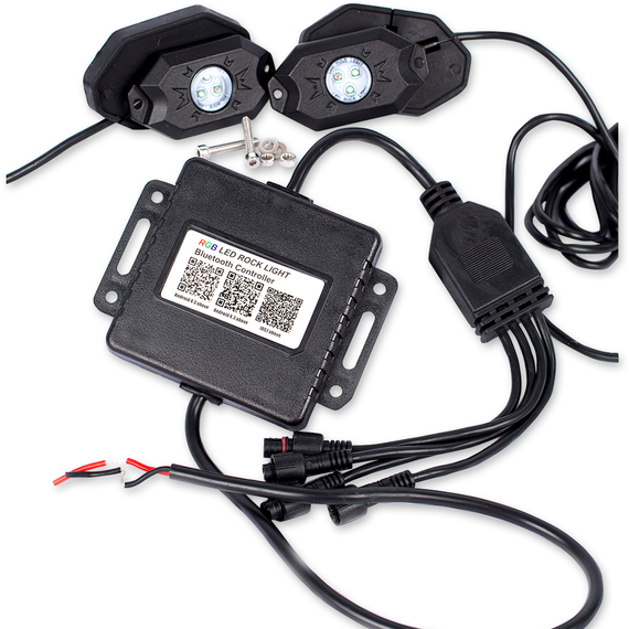 Caracteristicas: Four-pack of Rock Lights features customizable colors and patterns, all controlled thru Bluetooth® Waterproof, secure connections to each pod means Rock Lights can be used on undercarriage Built-in music control makes lights beat to music from your phone or external source Adjustable speed, brightness and strobe speed to customer color patterns Includes flat and roll bar mounts; wiring included