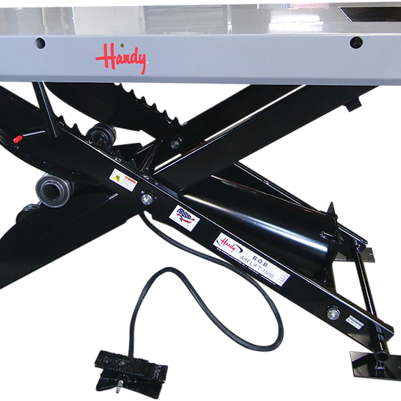 Caracteristicas: The B.O.B 1500 Air Lift solves numerous challenges in today's professional workshop Designed for the fully-dressed motorcycles, trikes and quads Lowers to a minimum height of 10" Includes a dropout for convenient tire changes Air source is 90-100 psi. Ramp measures 40" Weighs 560 lb.